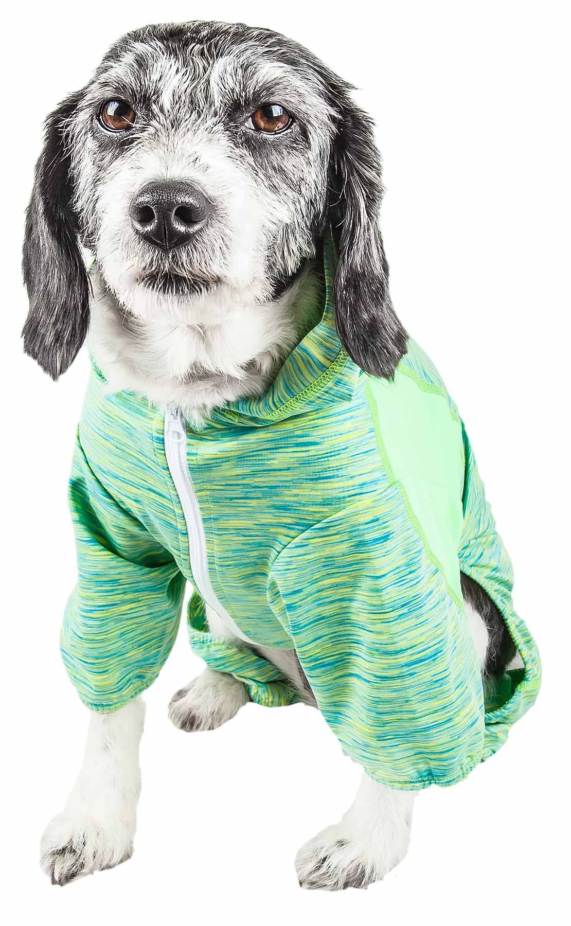 The Pet Life ACTIVE 'Downward Dog' Full Bodied Hoodie is an equipped Performance system that maintains year-round body temperature while providing complete flexibility. This Yoga-inspired material features dual Lightweight Micro-Treated Quick-Drying Fabrics that dry really fast that repels perspiration while offering Anti-Odor technology that assists with odor causing microbes. Features 4-way Stretch construction that move better in every direction for great Mobility and is extremely Lightweight and elastic that feels almost like a second-skin. Additionally this Hoodie features strategically mapped ventilation points for added Breathability. Features a tapered expandable fit with stretch-banded lining that expands for increased growth room. Offers UV Protection against the suns harmful rays and fitted nicely around the body to help assist in containment or collection of shedded hairs. Design features Dual Reinforced stitching at every seam for Durability and a leash-slit along the backside, a pull-over hood and a zipper underneath for convenient on and off access with Reflective Taping for added night visibility. Machine Washable. This style is part of our Pet Life Activewear Collection. Available in Multiple Sizes and Colors.